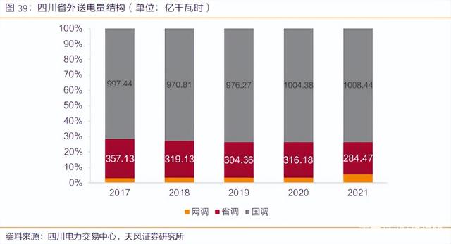 此外,省网统调电站承担调峰调频和旋转备用等辅助服务功能,且必须执行四川省富余电量等降价政策,是弃水压力的主要承担方。从四川省外送电量结构来看,2017-2021年国调机组外送电量占全口径外送电量比例稳中有升,从2017年的71.8%升至2021年的73.7%,但是省调机组的外送电量占比从2017年的25.7%降至2021年的20.8%。受到调度优先级及外送通道的制约,大渡河水电站等省调机组外送电量增长乏力。