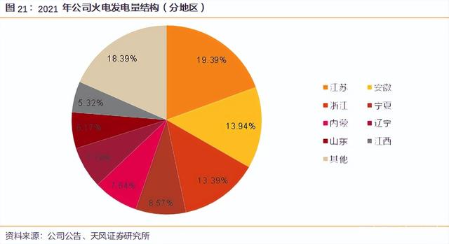 分区域来看,我国经济发达地区用电量及增速较高。据中电联预测,2022年迎峰度夏期间,全国电力供需总体平衡,用电高峰时段电力供需偏紧。其中,南方、华东、华中、华北区域用电高峰时段电力供需偏紧。迎峰度冬期间,全国电力供需总体平衡,用电高峰时段电力供需偏紧。其中,南方、华东、华中、西北区域用电高峰时段电力供需偏紧。从公司层面来看,公司火电机组在经济发达地区的比例较高,2021年在江苏、安徽、浙江的火电发电量占公司火电发电量的46.72%,有望更加充分受益于电价上浮对燃料成本上涨的疏导。