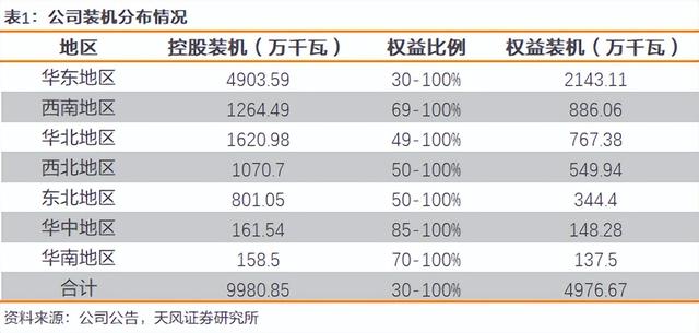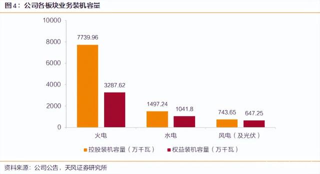 公司电源结构中火电占主导地位,同时兼顾可再生能源发展。公司业务涉及火电、水电、风电、光伏发电及煤炭等多个领域,分布于全国 28 个省、市、自治区。截至2021年底,公司总控股装机容量为9980.85万千瓦,其中火电控股装机容量7739.96万千瓦,水电控股装机容量1497.24万千瓦,风电控股装机容量707.06万千瓦,光伏装机容量36.59万千瓦;总权益装机容量为4976.67万千瓦,其中火电权益装机容量3287.62万千瓦,水电权益装机容量1041.8万千瓦,风电权益装机容量618.13万千瓦,光伏权益装机容量29.12万千瓦。
