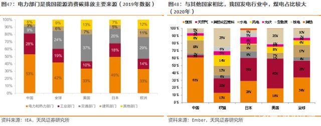 碳中和、碳达峰承诺下,电力部门深度脱碳是必经之路。经济增长背景下我国能源需求不断增加,而我国当前能源结构仍然以化石能源为主。据IEA发布的2019年数据,我国能源消费产生的二氧化碳排放量中,电力与热力部门碳排放占比高达53%,电力部门深度脱碳是实现碳中和的重要途径。目前我国电源结构仍以煤电为主,2020年煤炭发电占比达61%,而同期美国、欧盟、日本煤电占比仅为19%、13%、29%。因此我们认为,提高可再生能源发电占比,是电力部门实现能源减排的必由之路。