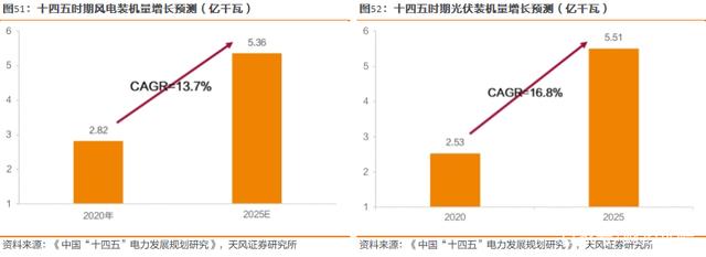 根据全球能源互联网发展合作组织预测,到2025年,我国清洁能源装机量将达到17亿千瓦,其中风电装机容量将达到5.36亿千瓦,2020-2025年CAGR达13.7%;光伏装机容量将达到5.51亿千瓦,2020-2025年CAGR达16.8%。