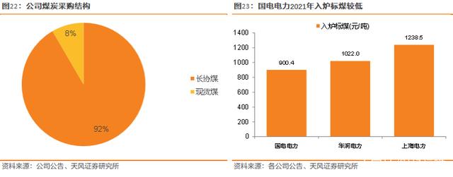 在煤炭供给偏紧的背景下,公司充分利用集团优势,长协煤占比高,有望有效缓解燃料成本压力。公司充分利用国家能源集团“煤电路港航”一体化产业协同优势,提升内部优质长协煤炭资源比例及兑现率。2021年,公司共采购煤炭1.91亿吨,其中长协煤总量1.75亿吨,占比92%。公司把握采购结构和节奏,优化采购煤种和热值,深入开展精细化配煤掺烧;在燃料智能化、智能发电、电力安全生产标准化等方面,开展了很多前沿探索,积累了很多成果经验,管控水平行业领先。从2021年入炉标煤来看,公司仅为900.4元/吨,明显处于行业较低水平。