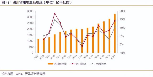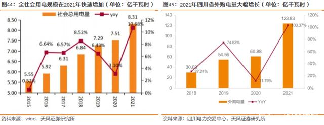 ·全社会电力供需偏紧:全国范围内,在经济走出疫情影响、出口超预期增长的大背景下,2021年我国社会用电量出现超预期高增长,而发电企业受到有效产能不足的影响而供电紧张(尤其是火电);四川省内用电存在结构性问题。由于水电具有季节性,枯水期发电量远低于丰水期发电量,导致四川电网在冬季枯水期高度依赖火电才能满足冬季用电高峰的需求,“水电大省”同样面临电力供需紧张局势。2021年四川省省间外购电量达到123.68亿千瓦时,同比高增103.37%
