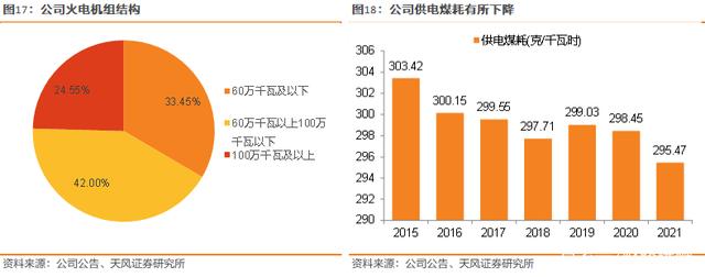 公司持续推进火电机组扩能升级,对在役煤电机组实施供热改造、节能降碳改造,降低供电煤耗和碳排放强度。截至2021年末,公司火电装机中,60万千瓦以上机组70台,占火电装机容量的比重为66.55%;100万千瓦及以上机组19台,占火电装机容量比重24.55%。2021年公司火电发电机组平均供电煤耗为295.47克/千瓦时,较上年下降2.61克/千瓦时。同时,公司计划十四五完成1930万千瓦煤电机组“三改”,供电煤耗降低4.38克/千瓦时,供热量增加4300万吉焦,机组调峰能力增加220万千瓦,改造后火电资产质量有望进一步提升。