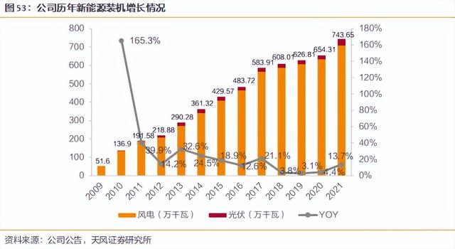 ·容量方面,公司新能源业务从2009年开始发力,10余年来装机容量快速扩张,截至2021年底,公司风电控股装机容量为707.06万千瓦,光伏发电控股装机容量为36.59万千瓦,新能源板块总体装机量2009-2021年CAGR达24.9%。