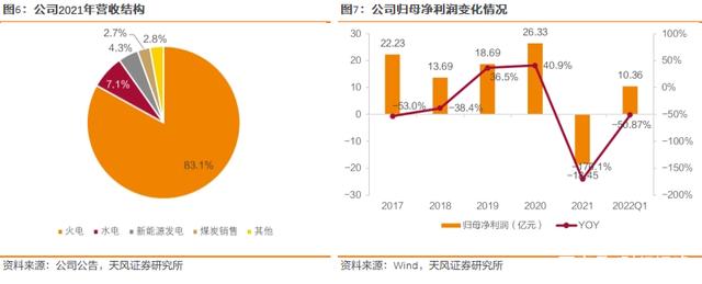 从营收结构来看,2021年公司实现营业收入1681.85亿元,其中火电业务实现营收1397.38亿元,占比达83.1%,因此公司业绩受燃料价格影响较大,火电成本端阶段性变动会对公司业绩产生显著影响。公司2021年实现归母净利润-18.45亿元,同比降低170.1%,主要原因即在于2021年燃煤价格大幅上涨导致公司燃料成本大幅增加,伴随2022年3月起煤价逐渐进入下行通道,公司一季度业绩水平明显改善。
