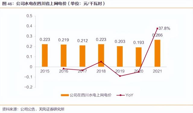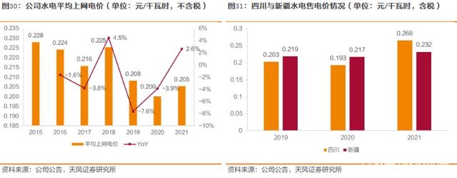 2021年公司水电的平均上网电价(不含税)为0.205元/千瓦时,同比增长2.6%,扭转了电价的下降趋势。分省市看,2021年公司在四川和新疆的水电销售电价分别达到0.266、0.232元/千瓦时,分别同比增长37.8%、6.9%。