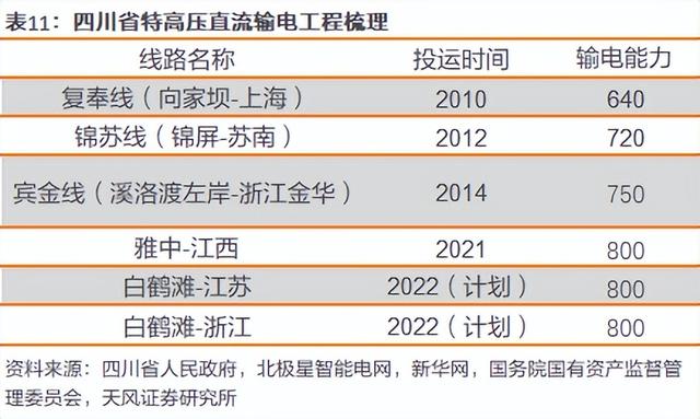 ·省外:新一轮外送通道建设启动,四川省外送能力逐步增强。在复奉、锦苏、宾金三大直流特高压线路的基础上,四川省开启了“新三直”特高压工程建设。其中雅中-江西线路已于2021年投运,将川电外送的能力提升至3860万千瓦,年外送电量能力超1700亿千瓦时。2021年四川省全口径外送电量为1368.25亿千瓦时,今年白鹤滩-江苏和白鹤滩-浙江两条线路投运后,四川省年外送电量能力将达到约2500亿千瓦时,约为2021年的1.8倍。