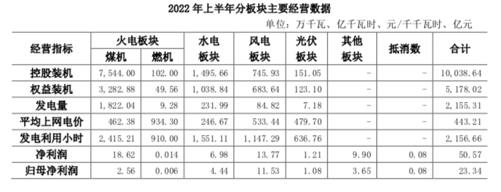 2022 年上半年,全国规模以上电厂发电量 3.96 万亿千瓦时,其中火电发电量 2.73 万亿千瓦时,占比 68.8%。在目前全球能源供应偏紧的环境下,火力发电仍是当前我国电力供应的主要来源,是保障我国电力安全稳定的基础。面对能源供需紧张、资源竞争激烈、疫情持续影响等困难挑战,国电电力主动扛起“疫情要防住、经济要稳住、发展要安全”的责任担当,上半年实现营业收入911.58 亿元,同比增长 20.03%;利润总额65.94 亿元,同比增长 0.76%;归属于上市公司股东的净利润22.95 亿元,同比减少 22.10%;加权平均净资产收益率5.107%,同比增长 0.76 个百分点;基本每股收益0.129 元/股,同比下降 19.88%。对于上半年净利润的同比下降,国电电力在半年报中解释系因燃煤价格同比上涨,导致发电营业成本较上年上升所致。