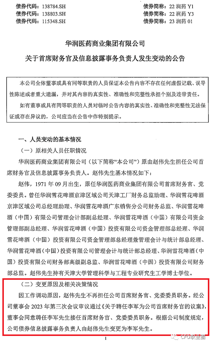 近日,华润医药商业集团发布《关于首席财务官及信息披露事务负责人发生变动的公告》。