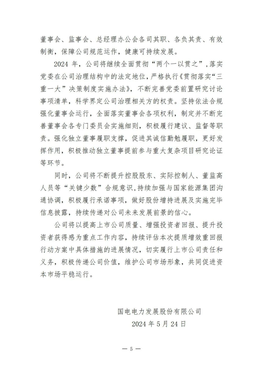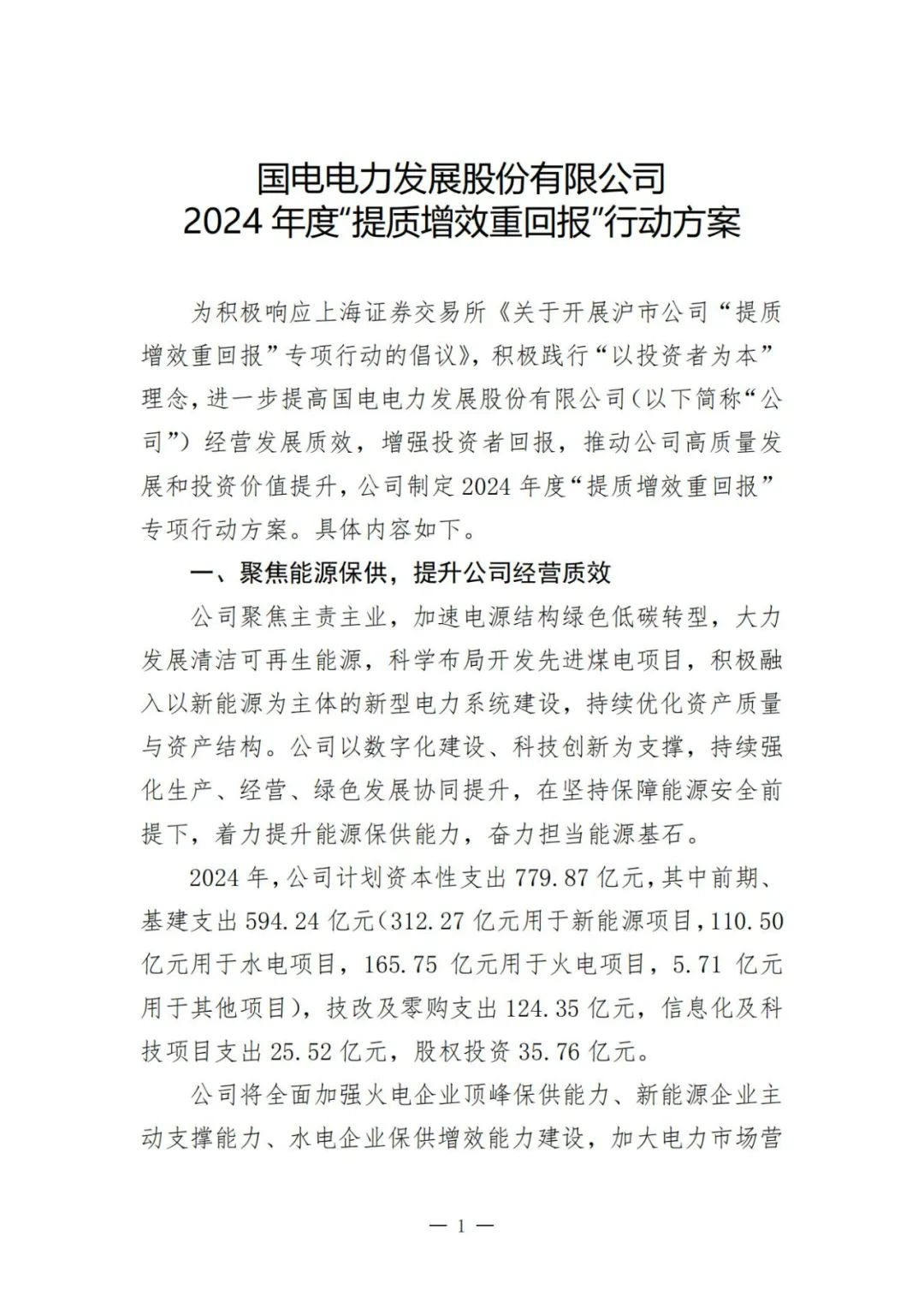 5月24日,国电电力发布2024年度“提质增效重回报”行动方案。