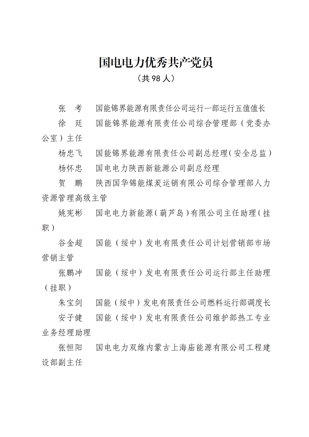 6月28日,国电电力党委作出表彰决定,授予98人优秀共产党员称号;授予78人优秀党务工作者称号;授予87个集体先进基层党组织称号。具体名单如下: