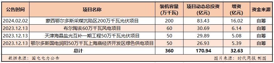 去年至今,国电电力积极投建风光项目。据时代周报记者统计,2023年12月至2024年2月,国电电力公布了四个风光项目,涉及鄂尔多斯、天津、布尔陶亥等地,项目总装机容量高达3.60GW,动态总投资达170.94亿元,同时,国电电力还表示要对其全资子公司增资32.63亿元用于项目投资建设。