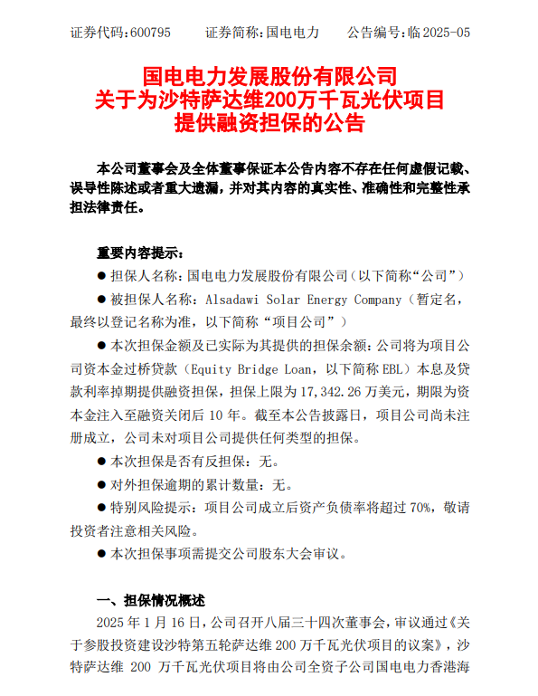 3月4日,国电电力发布关于为沙特萨达维200万千瓦光伏项目提供融资担保的公告。