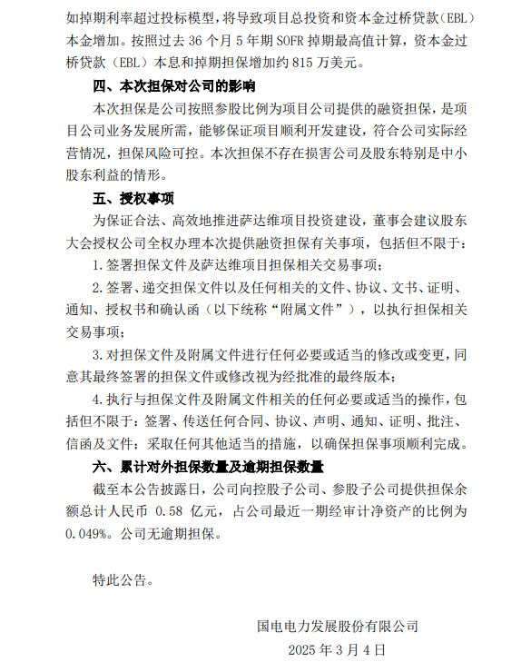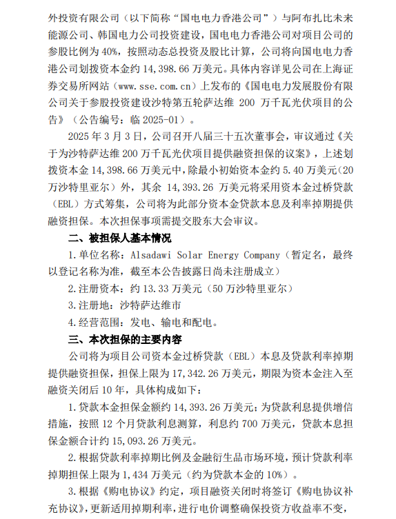 2025 年 3 月 3 日,公司召开八届三十五次董事会,审议通过《关于为沙特萨达维 200 万千瓦光伏项目提供融资担保的议案》,上述划拨资本金 14,398.66 万美元中,除最小初始资本金约 5.40 万美元(20万沙特里亚尔)外,其余 14,393.26 万美元将采用资本金过桥贷款(EBL)方式筹集,公司将为此部分资本金贷款本息及利率掉期提供融资担保。本次担保事项需提交股东大会审议。
