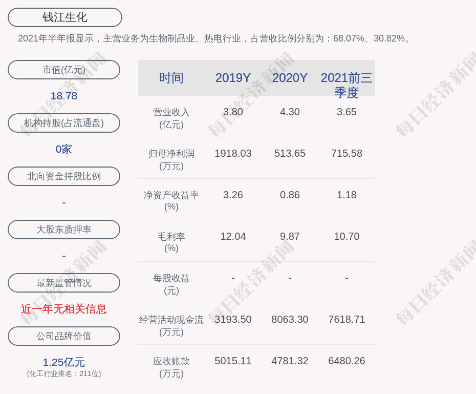 2021年半年报显示,钱江生化的主营业务为生物制品业、热电行业,占营收比例分别为:68.07%、30.82%。