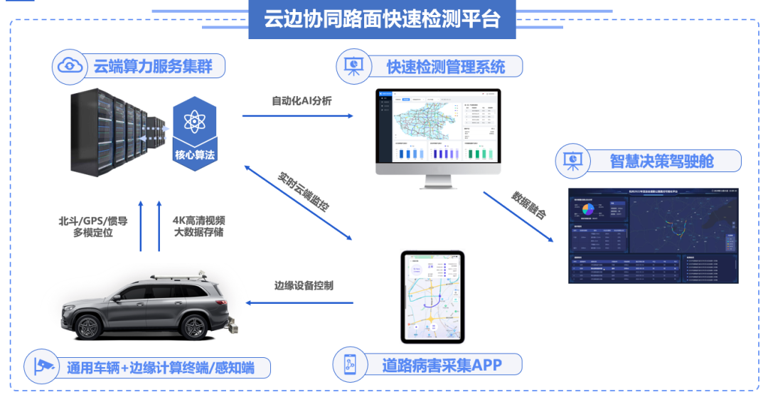 快速检测平台以人工智能、大数据技术为基础,利用多模数据融合实现路面病害的高效识别,优化平台交互模式,降低设备使用的技术门槛,大大提高病害数据的使用效率。