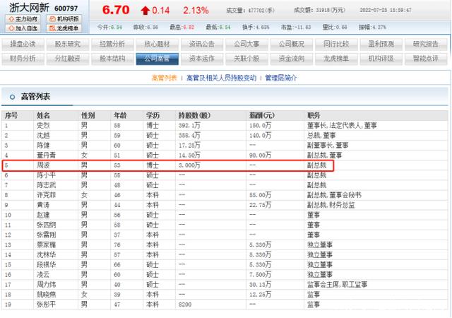 此外,周波还算是一个比较活跃的人,他最近一次代表公司公开露面是在2021年的10月11日,周波代表浙大网新与钢管工业发展有限公司签订了战略合作协议。