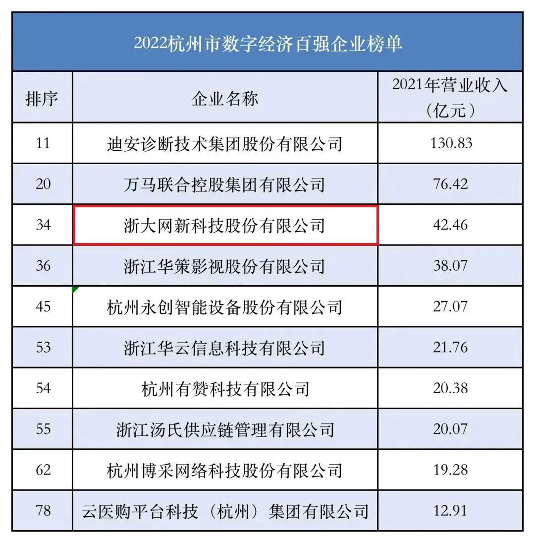 日前,杭州市工业经济联合会、企业联合会、企业家协会(简称市“三会”)发布了2022杭州市制造业百强企业、数字经济百强企业、高成长性百强企业三张榜单,浙大网新上榜2022杭州市数字经济百强榜单。