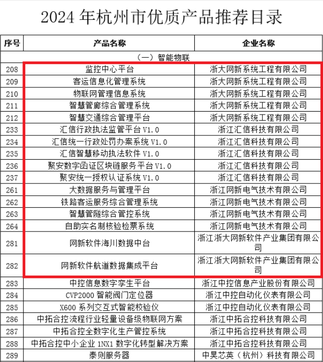 近日,杭州市经济和信息化局公布了《2024年杭州市优质产品推荐目录》,浙大网新旗下子公司网新系统、网新电气、汇信科技、网新软件自主开发的多项智能物联产品入选目录榜单,公司实力再获认可。