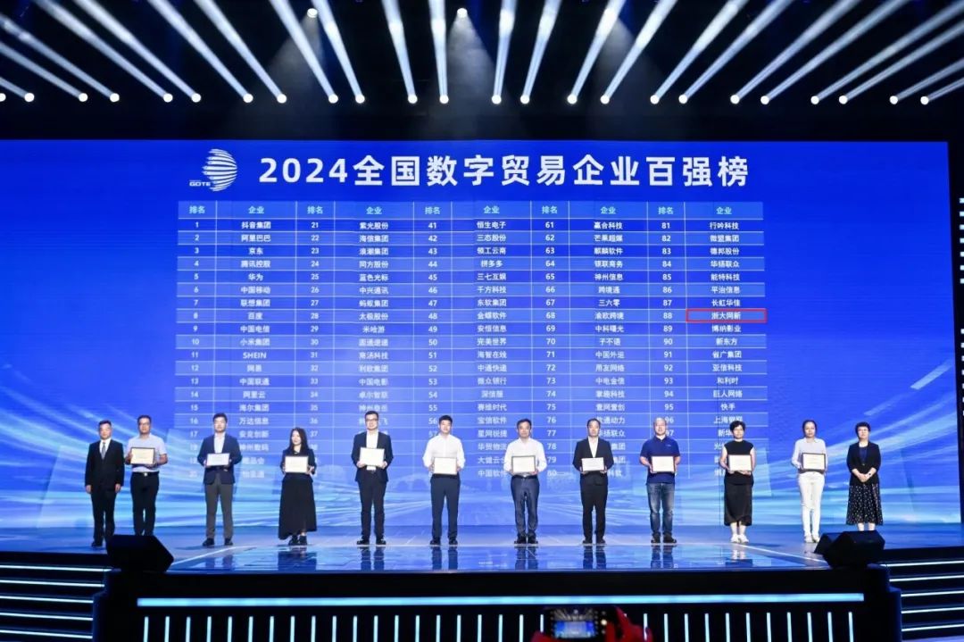 活动现场发布了2024全国数字贸易企业百强榜、福布斯2024全球数字贸易行业企业100榜单,举行了2024全球数字贸易创新大赛、全国高校智慧投资算法模型挑战赛、华语数字视听全球影响力企业与作品等颁奖仪式。其中,浙大网新凭借自身综合实力,在众多企业中脱颖而出,荣登2024全国数字贸易企业百强榜。