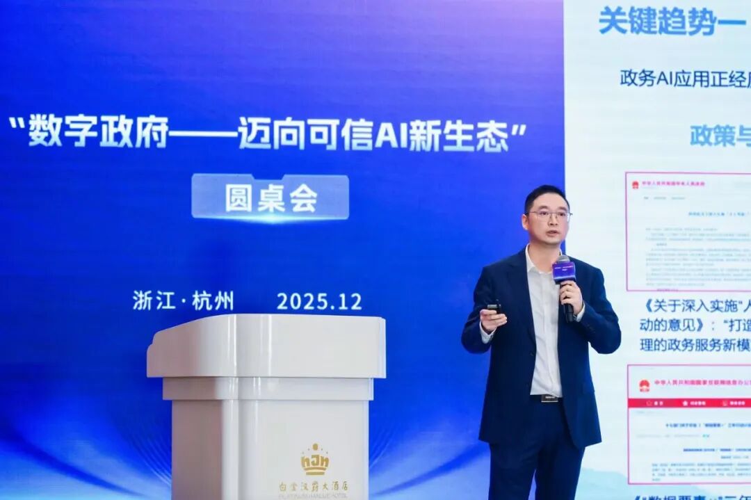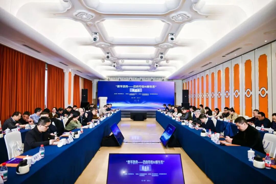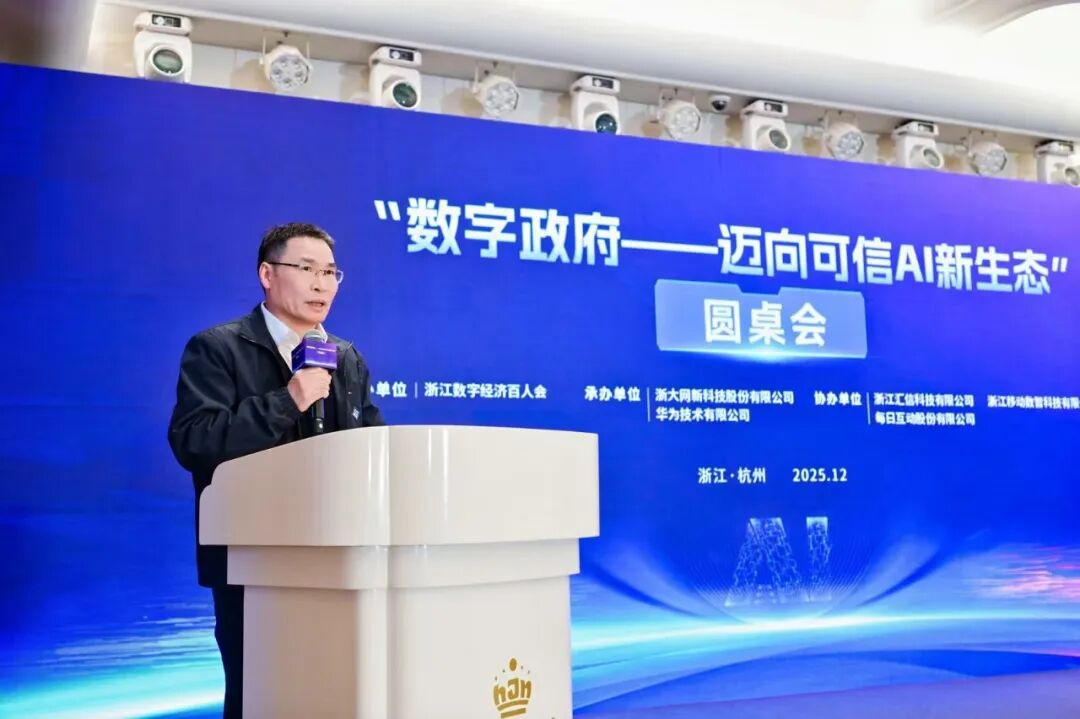 当天下午,由浙江数字经济百人会主办, 浙大网新 科技股份有限公司、 华为技术有限公司 等联合承办的“数字政府——迈向可信AI新生态”圆桌会在杭州顺利召开。本次会议作为“2025浙江数字经济百人会‘AI+生态’大会”的重要专题会之一,汇聚了各级政府部门代表、优秀科技企业及专家学者代表等各方力量,通过前沿趋势解读、创新案例分享、生态供需对接与圆桌深度对话等形式,共探数字政府建设的新范式、新规则、新机遇,共同开启数字政府可信AI生态的崭新篇章。