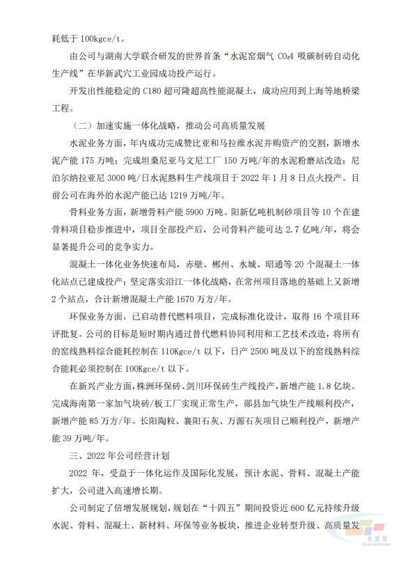 2022年受益于一体化运作及国际化发展,预计水泥、骨料、混凝土产能扩大,公司进入高速增长期。公司制定了倍增发展规划,规划在“十四五”期间投资近600亿元持续升级水泥、骨料、混凝土、新材料、环保等业务板块,推进企业转型升级、高质量发展。2021年,公司资本支出约71.6亿元,较2020年增长近68%。2022年,公司计划资本支出约122亿元,快速推进公司发展战略的落地。