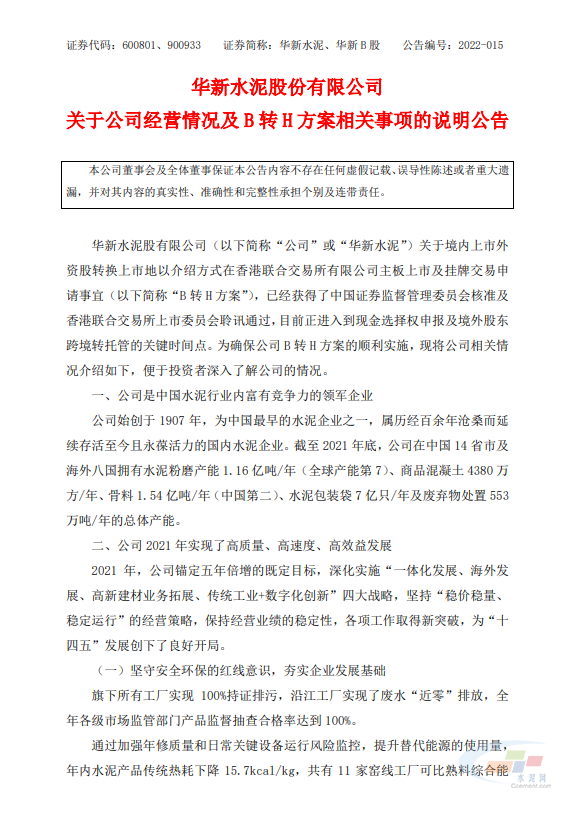 华新水泥股份有限公司3月9日晚间发布《关于公司经营情况及 B 转 H 方案相关事项的说明公告》称,截至2021年底,公司在中国14省市及海外八国拥有水泥粉磨产能1.16亿吨/年(全球产能第7)、商品混凝土4380万方/年、骨料1.54亿吨/年(中国第二)、水泥包装袋7亿只/年及废弃物处置553万吨/年的总体产能。