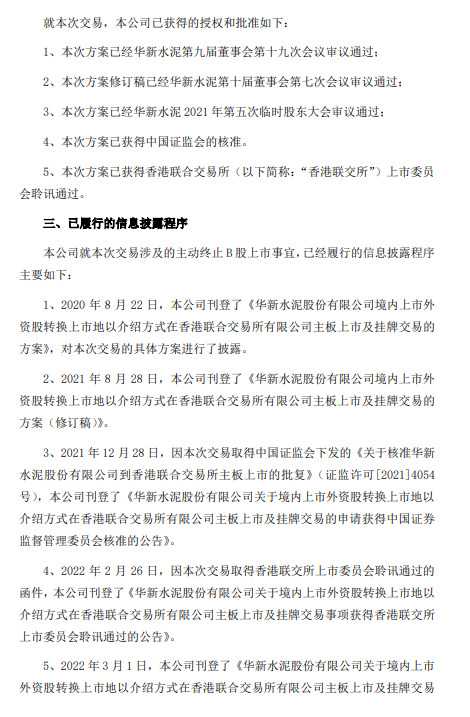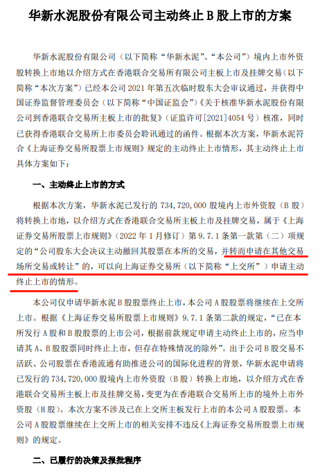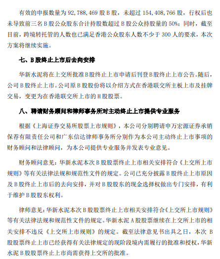 华新水泥在公告里进一步指出,公司将在提出本申请后以及上交所受理本申请后分别发布相关公告,并在上交所批准本公司 B 股终止上市申请后刊登 B 股终止上市公告。本公司 B 股终止上市后,公司将执行香港联交所 H 股登记上市流程,B 股将转换为在香港联合交易所上市的境外上市外资股。