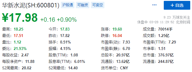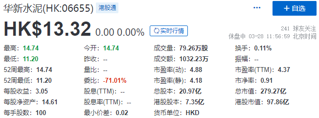华新水泥是次介绍上市,H股开盘报价14.74港元,截至午间收市,H股每股报13.32港元,总市值为279.27亿港元。截至午间收市,A股每股报人民币17.98元,总市值为人民币376.97亿元。