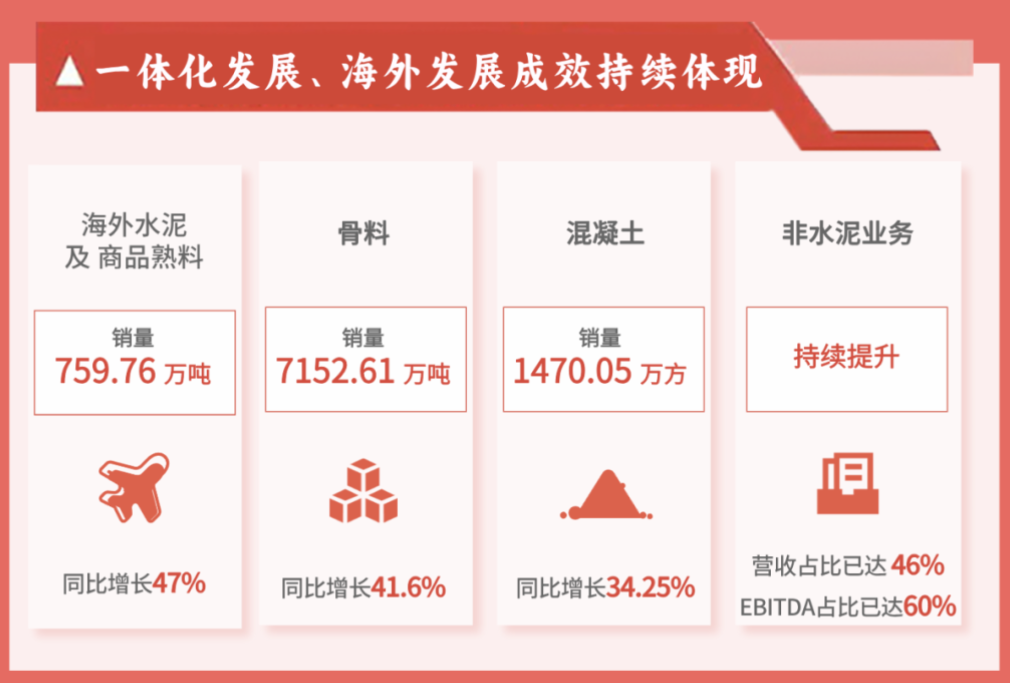 报告期内,公司水泥业务实现营业收入86.66亿元,同比下滑11.25%,其中:国内水泥业务实现营业收入51.06亿元,同比下滑31.57%;海外水泥业务实现营业收入35.78亿元,同比增长55.41%;骨料业务实现营业收入29.62亿元,同比增长36.96%;混凝土业务营业收入39.43亿元,同比增长24.21%。
