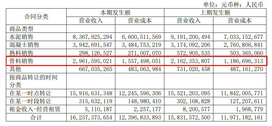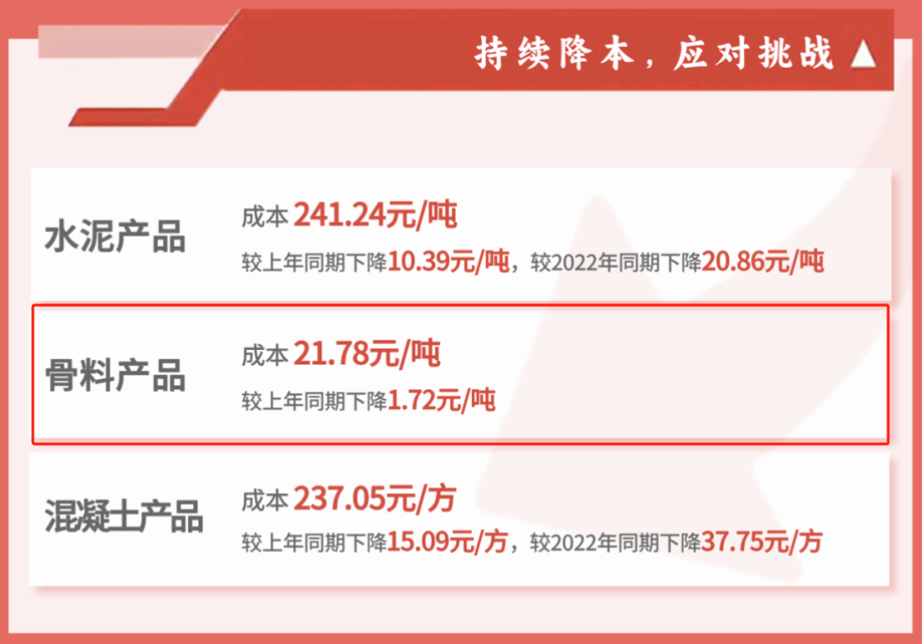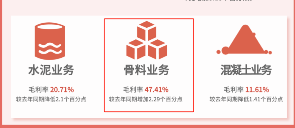 盈利能力方面,本期水泥产品因销售价格较上年同期下滑21.76元/吨至304.24元/吨,成本较上年同期下降10.39元/吨至241.24元/吨;骨料业务因销售均价下滑1.40元/吨至41.41元/吨,成本下降1.72元/吨至21.78元/吨;混凝土业务因销售价格下降21.68元/方至268.20元/方,成本下降15.09元/方至237.05元/方。