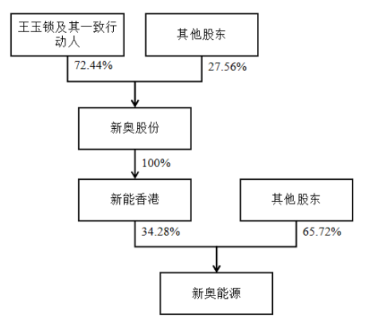 新奥股份与新奥能源属于“母子”关系,早在2019年,新奥股份就以“蛇吞象”形式从朱玉锁控制的ENN Group International Investment Limited(下称“新奥国际”)及其全资子公司精选投资手中并购新奥能源部分股权,并不断增持。目前,新奥能源的实控人为王玉锁,而王玉锁及一致行动人新奥国际、新奥控股投资股份有限公司、新奥科技发展有限公司、廊坊合源投资中心(有限合伙)(下称“廊坊合源”)、河北威远集团有限公司通过新能香港持有新奥能源34.28%股权,此次要约收购则是要实现对新奥能源的100%控股。