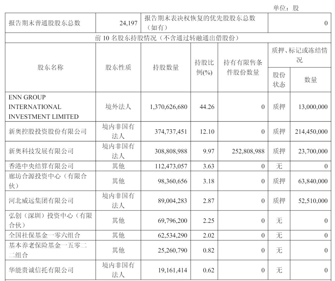 截至2024年3月31日,ENN GROUP INTERNATIONAL INVESTMENT持股为44.26%,新奥控股投资股份有限公司持股为12.1%,新奥科技发展有限公司持股为9.97%,香港中央结算有限公司持股为3.63%;