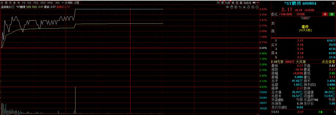 12月6日开盘,*ST鹏博(600804.SH)开盘后迅速走高,并于10:40左右封至涨停板。