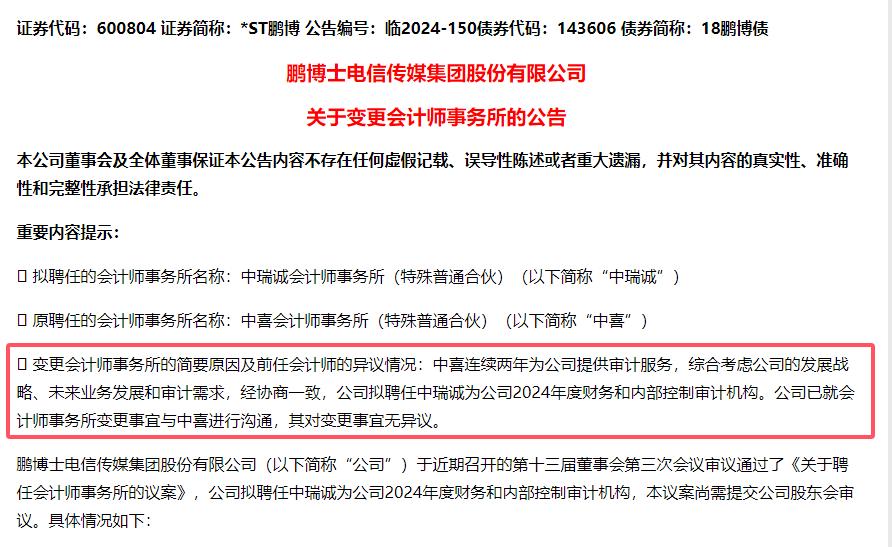 经济导报记者注意到,*ST鹏博在4日发布的股票交易风险提示公告中称,因被中喜出具了无法表示意见的《2023年度审计报告》,触及《上海证券交易所股票上市规则(2023年8月修订)》,第9.3.2条第一款第(三)项规定,公司股票被实施退市风险警示。