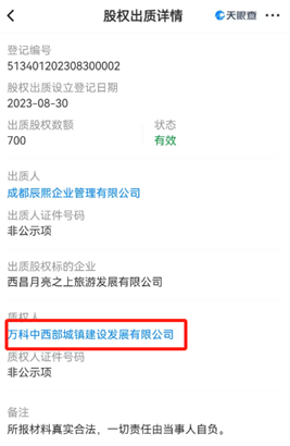 “西昌月亮之上旅游发展有限公司”和“四川邦诺企业咨询有限公司”的实控人、自然人李星,还是兰州万科之控股子公司“兰州普合共筑万科房地产开发有限公司”的董事,并是这家公司持股49%的股东“成都星辉创展集团有限公司”的控股股东及执行董事。更关键的是,关于“西昌月亮之上旅游发展有限公司”,还有向“万科中西部城镇建设发展有限公司”质押的信息,至今仍处于有效状态。