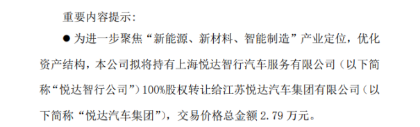 5月,悦达投资拟将持有的上海悦达智行汽车服务有限公司(以下简称“悦达智行”)100%股权以“白菜价”转让给关联方江苏悦达汽车集团有限公司,交易总额低至2.79万元。