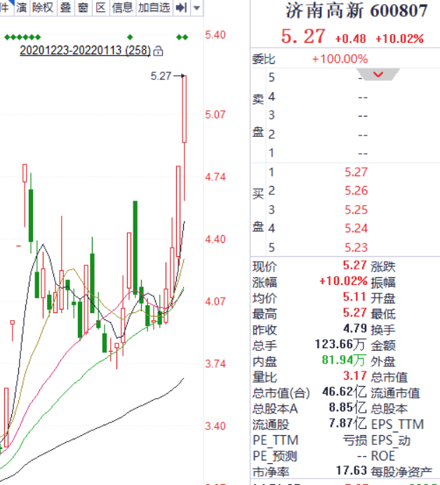 1月12日、13日连续两个交易日,济南高新均涨停封板。截至1月13日收盘,仍有5.7万手买单等待买入。