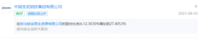 近日,中国宝武钢铁集团有限公司(简称宝武)将其在欧冶链金再生资源有限公司(简称欧冶链金)的股份比例从12.3630%增加到27.4053%,成为该企业的大股东。