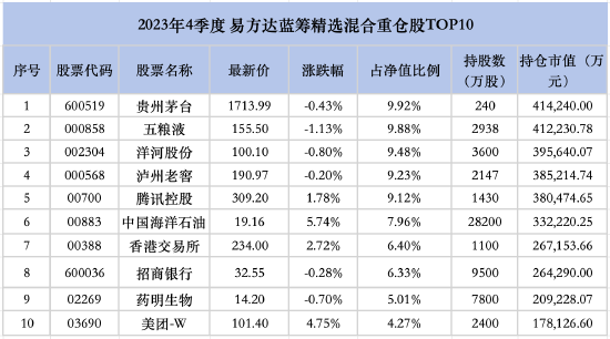3月29日,易方达基金发布旗下产品2023年年报,顶流基金经理张坤的最新重仓股浮出水面。其中,易方达蓝筹精选是张坤管理规模最大的产品,张坤在年报中表示,该基金在2023年股票仓位基本稳定,前五大重仓股仍为贵州茅台、五粮液、洋河股份、泸州老窖以及腾讯控股,且占基金净值比均在9%以上。在增减仓上,贵州茅台、腾讯控股、招商银行等较上期有明显减仓动作,其余持仓变动幅度不大。