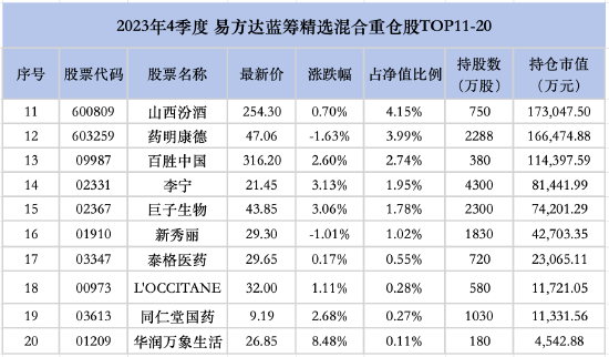 具体来看,与2023年半年报披露的持股明细相比,张坤在隐形重仓股中大笔加仓了山西汾酒,持股数达750万股,增幅达25倍。另外,张坤的持仓风格延续了对赛道“高毛利率、高净利率”始终如一的信念,在隐形重仓股中新进了女性消费赛道,例如:医美胶原蛋白领域的巨子生物、女包领域的新秀丽、医美面膜领域的敷尔佳以及女性个护领域的护手霜品牌L‘OCCITANE。在第11-20位的隐形重仓股中,还包括药明康德、百胜中国、李宁、泰格医药、同仁堂国药、华润万象生活。