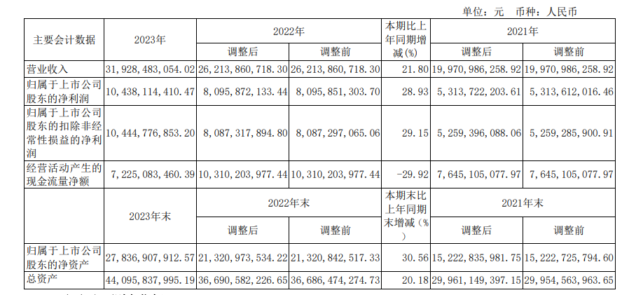 年报显示,2023年公司实现营业收入319.28亿元,同比增长21.8%;归属于上市公司净利润104.38亿元,同比增长28.93%。基本每股收益8.56元/股,同比增长28.78%。公司营收、净利润连续9年实现两位数以上高增长,每股收益持续创下新高。
