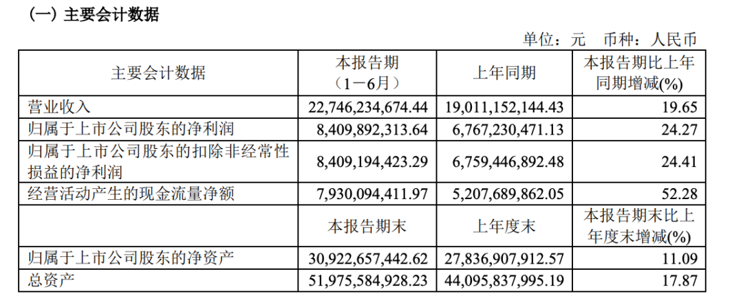 8月27日,山西汾酒披露2024年半年报,2024年前6个月公司营业总收入为227.46亿元,较去年半年报营业总收入增加37.35亿元,实现5年连续上涨,同比较去年同期上涨19.65%。归母净利润为84.10亿元,较去年半年报归母净利润增加16.43亿元,实现5年连续上涨,同比较去年同期上涨24.27%。