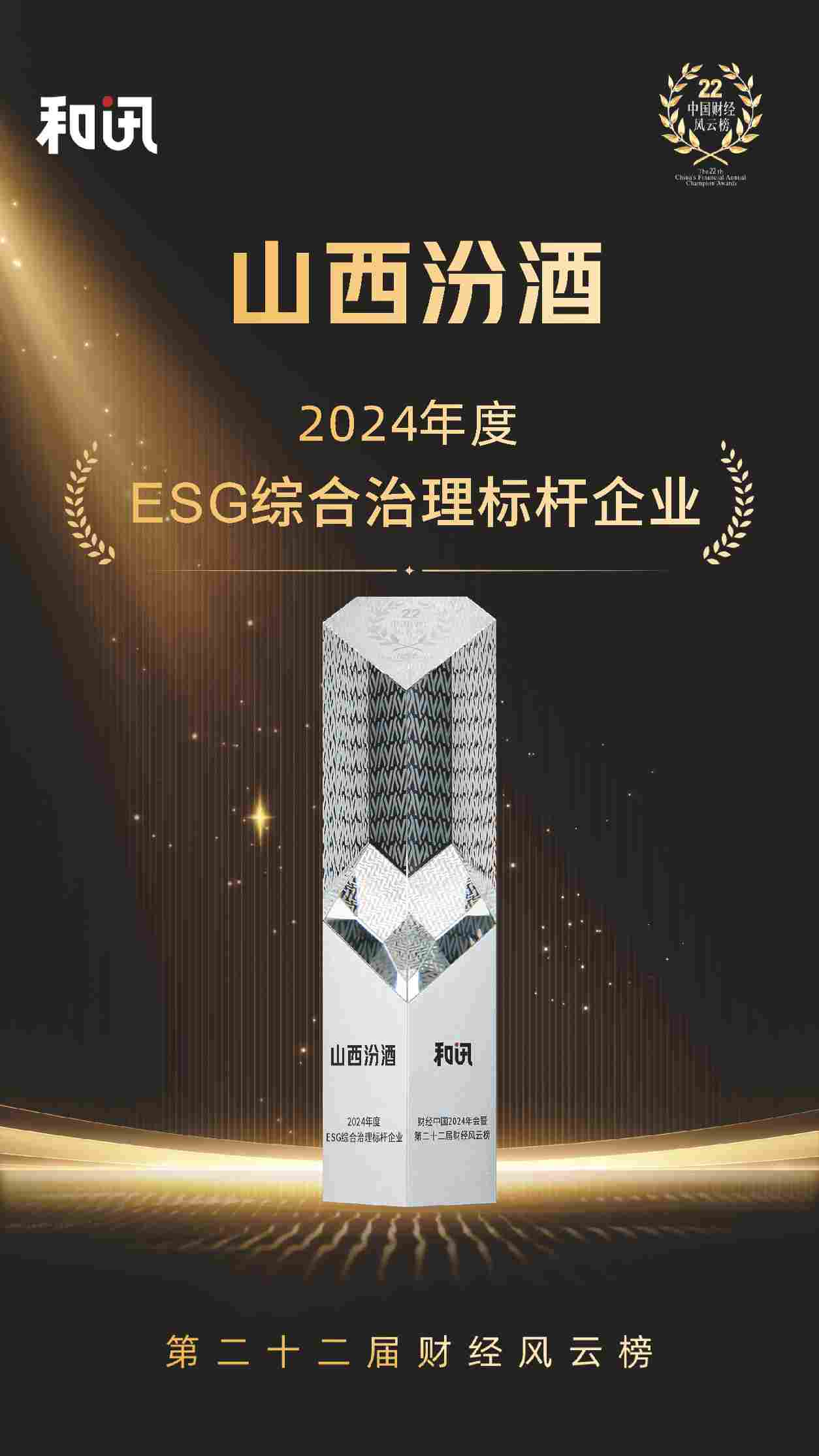 由联办集团、和讯主办,财经中国会承办的财经中国年会暨第二十二届财经风云榜,以社会责任贡献、ESG优秀实践、ESG综合治理、公益行动为纬度,对过去一年ESG表现优异的企业进行表彰。山西汾酒(600809)凭借在绿色发展、产品质量、员工关怀和社会责任方面的亮眼表现,获得“2024年度ESG综合治理标杆企业”。