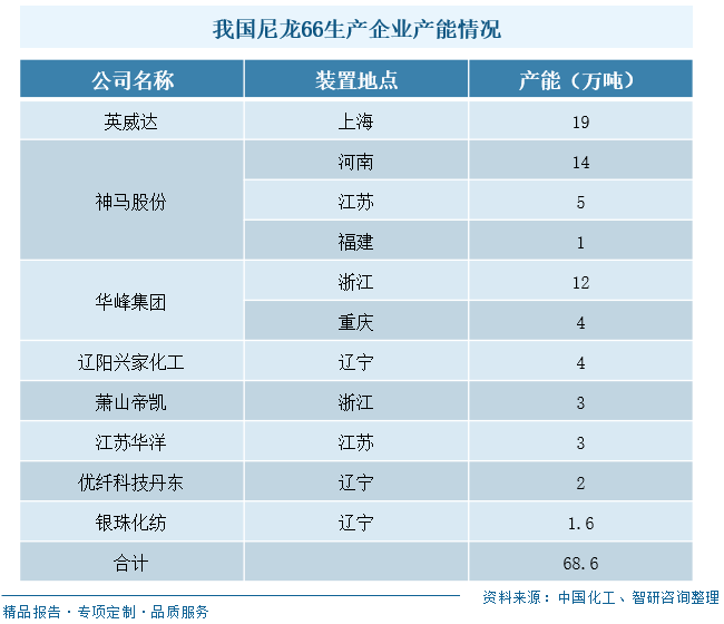 从国内企业看,目前我国共有7家尼龙66生产企业,前三大企业为神马股份、上海英威达和华峰集团,产能合计55万吨/年,约占全国总产能的80%。
