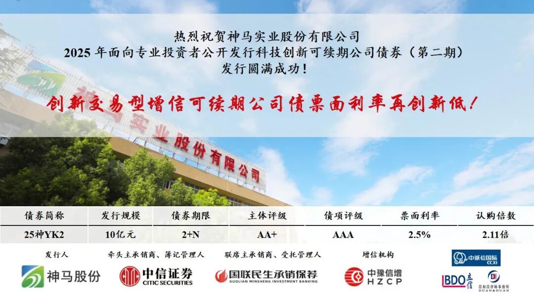 11月25日, 神马股份 2025年面向专业投资者公开发行的可续期公司债券(第二期)(债券简称:25神YK2)在上海证券交易所成功完成簿记。本期债券发行规模10亿元,期限为2+N年,最终票面利率确定为2.50%,创下公司债券发行利率的历史新低。