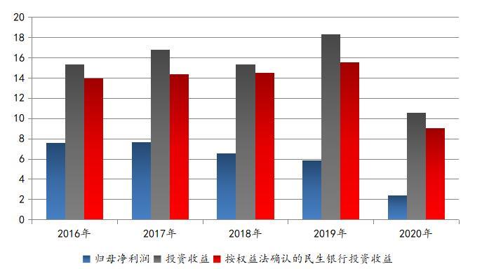 而重要的合营或联营企业中,东方集团分别持有锦州港股份有限公司(下称锦州港, 600190.SH)、中国民生银行股份有限公司(下称民生银行)、东方集团财务有限责任公司15.39%、2.92%、30.0%股权。若按权益法确认投资收益,近五年来,民生银行投资收益贡献较大,分别为13.98亿元、14.41亿元、14.55亿元、15.57亿元和9.06亿元,仅这五年就合计贡献约67.57亿元投资收益。显然,一旦民生银行收益不佳,则对当期投资收益产生较大影响,继而影响该年度上市公司利润。