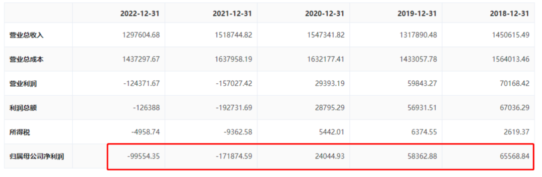 富凯财经查阅公司近6年业绩数据发现,东方集团在下坡路上越走越远。其中,2017年至2021年间,公司净利润分别为7.69亿元、6.56亿元、5.84亿元、2.40亿元、-17.19亿元。即使在2021年巨亏的低基数上,2022年公司营业收入继续下滑,全年实现营收129.72亿元,同比减少14.56%,净利润为亏损9.96亿元。