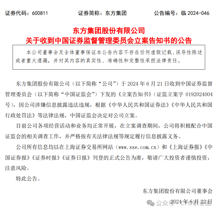 公告显示,东方集团于2024年6月22日披露了关于收到中国证监会立案告知书的公告,因公司涉嫌信息披露违法违规,根据《中华人民共和国证券法》《中华人民共和国行政处罚法》等法律法规,中国证监会决定对公司立案。